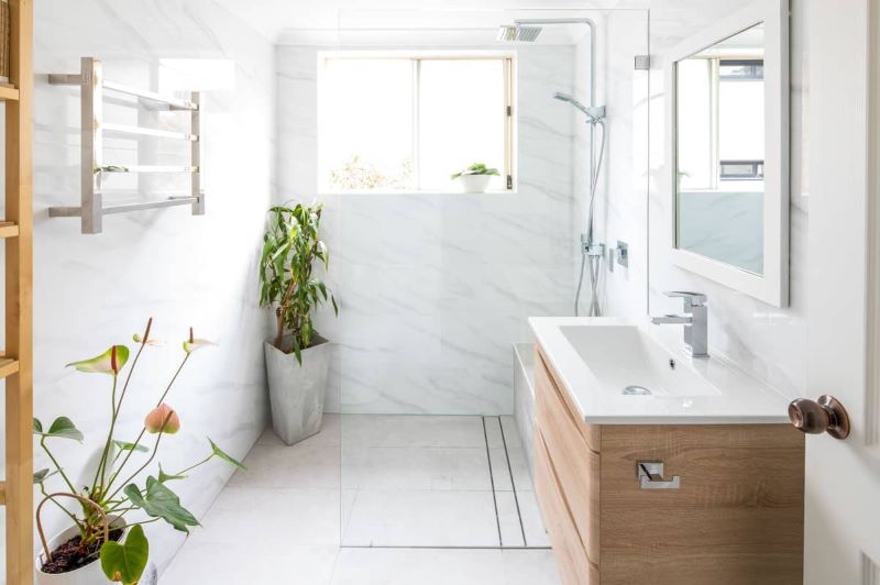 Không gian xanh là xu hướng thiết kế đang thịnh hành hiện nay, được lòng cả giới trẻ và tầng lớp trung niên. Việc có thêm cây xanh, ánh nắng ngập tràn trong phòng tắm mang đến sức sống và nguồn năng lượng tích cực. Trong các thiết kế này, gia chủ thường sử dụng tone màu trắng hoặc nâu gỗ sáng, kết hợp với cửa kính lớn để lấy ánh sáng tự nhiên. Đồng thời, hãy dùng một yếu tố có màu sắc đậm hơn để tô điểm thêm trong không gian này, chẳng hạn như kệ tủ và chậu cây xanh như trong mẫu tham khảo bên dưới.